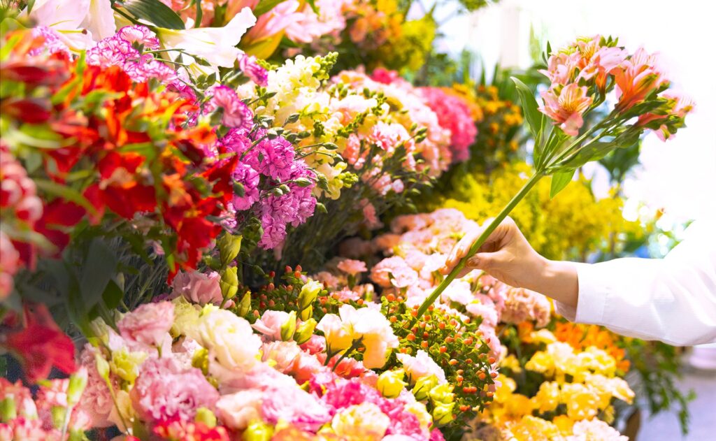 店頭には、たくさんのアレンジメントや花束が並び、